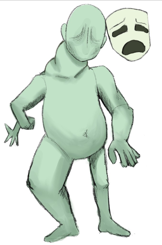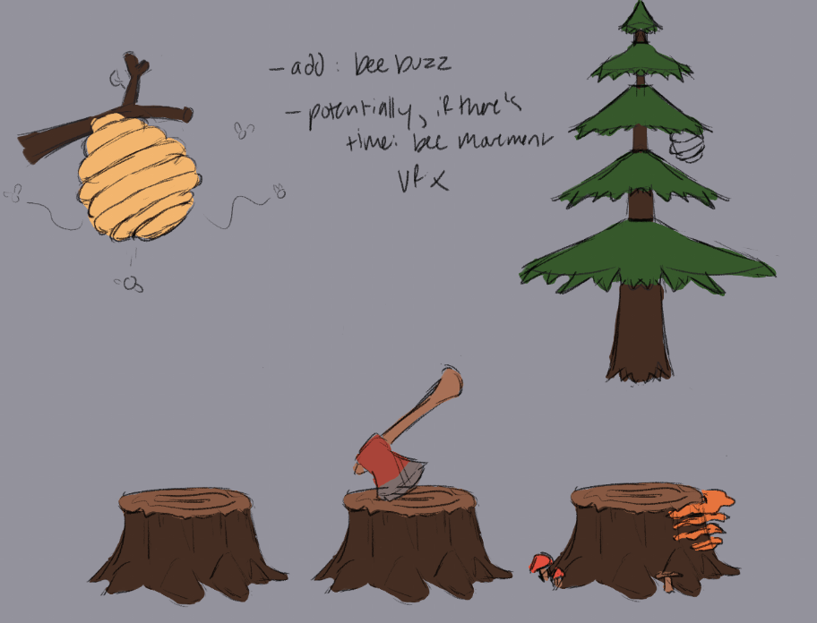 Asnav was meant to be a cobbled-together, warped version of the protagonist of the game, so I liked the idea that all his limbs are mismatched and broken, and he wore a mask to hide his face. Additionally, we were going to add additional props for the first level of the game, so I designed a few things in the background that could be added to flesh out the level, and make it seem more like a real forest. In the end, the tree design was added into the game as part of the background.